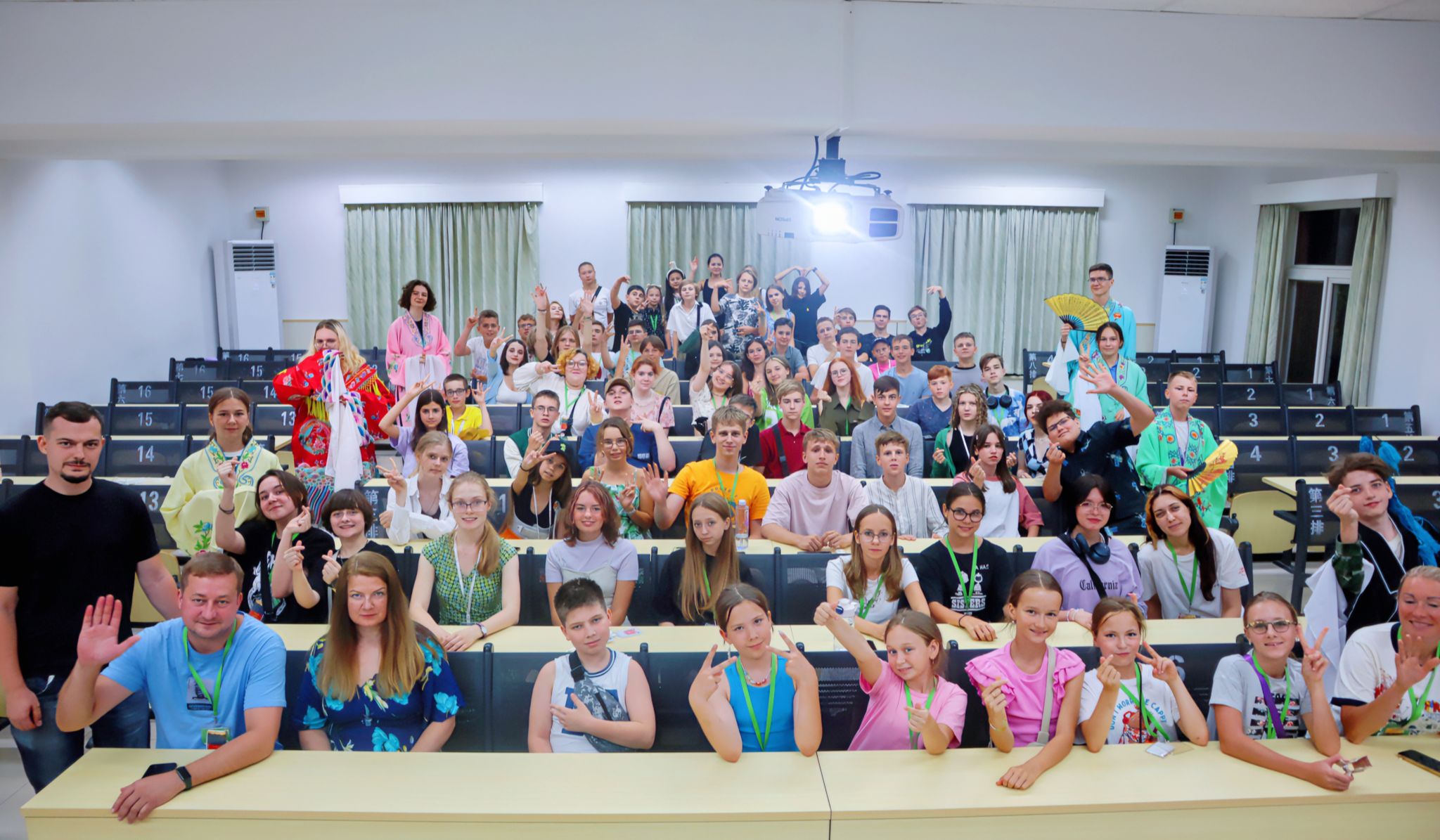 院长苏英霞教授、莫斯科1948中学和1329中学的领队老师及80名学员、任课老师、还有项目组相关老师及志愿者参加了隆重的结业典礼。