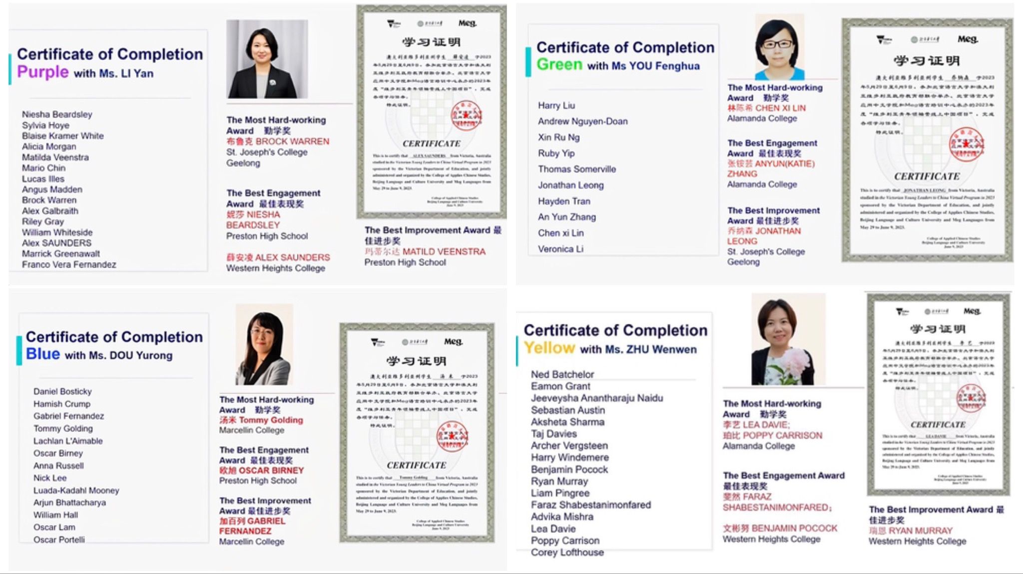 在闭营仪式上,来自Purple、Blue、Yellow、Green四个班级的汉语老师回顾了与同学们相处的温馨瞬间,表示为大家学习汉语的努力、认真和敢于迎接挑战的勇气感到骄傲。期待同学们能带着本次项目的收获,继续保持学习汉语的热情,做中澳友好交流的使者。