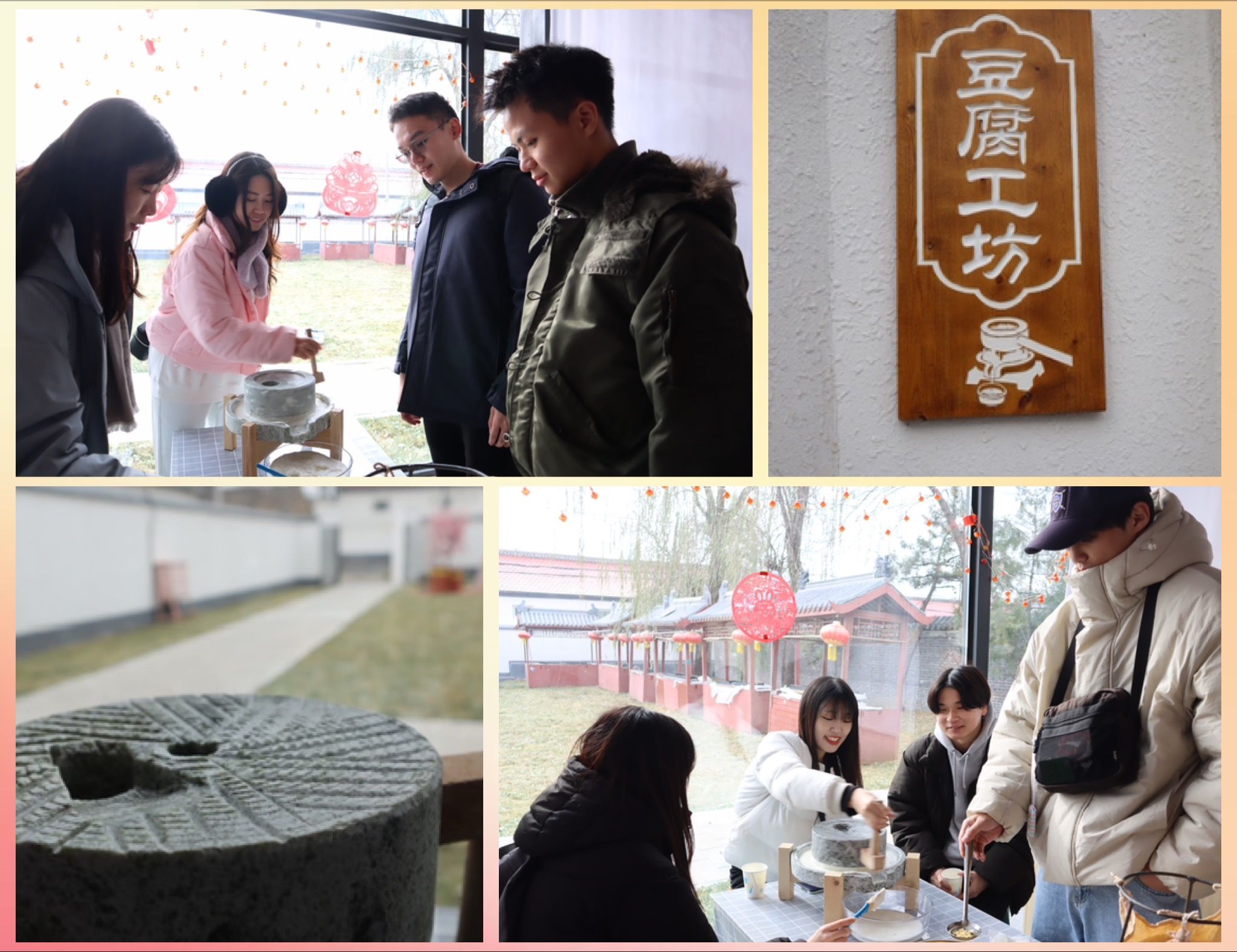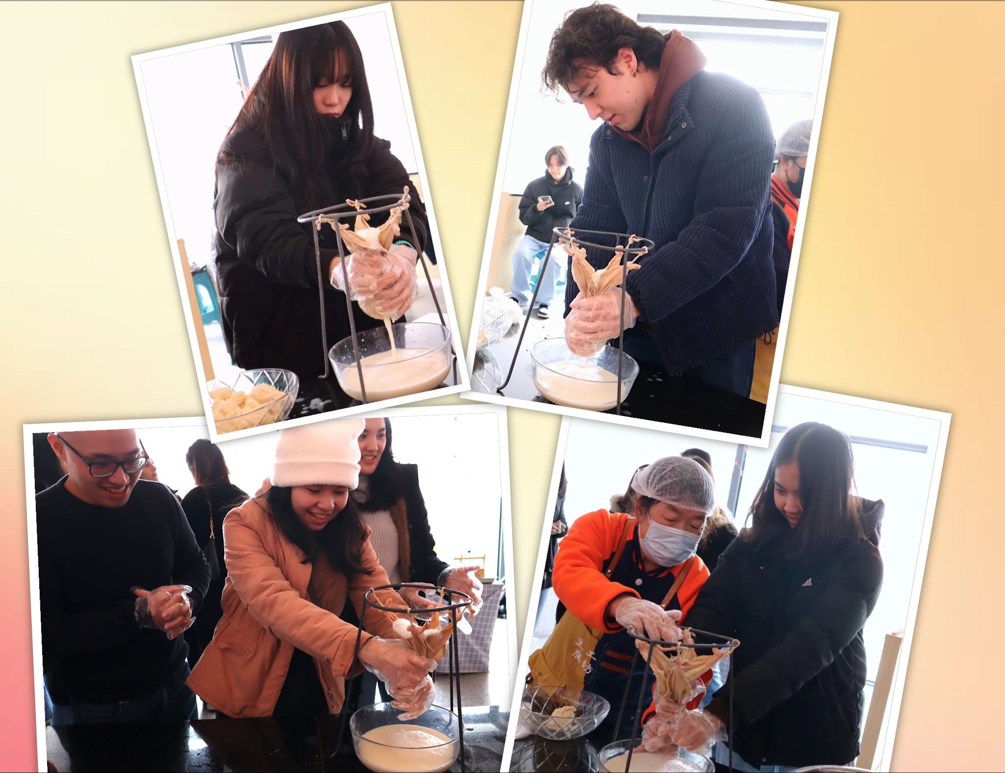 随后,学生们穿村来到柳沟的豆腐工坊,亲自体验了豆腐制作的全过程。从浸泡、磨浆、泼沫、滤渣到煮浆、点卤、压块成型。“十颗豆,逆时针磨十圈”,在现场工作人员的指导下,留学生们分成六个小组,组员们配合默契,兴致勃勃地添豆子、磨豆浆、滤豆浆、挤豆渣、点卤汁、压豆腐,经过一系列的操作,最终热气腾腾的新鲜豆腐被端上了桌,撒上一些盐和小葱,一道美味的小葱拌豆腐就呈现在大家的面前。同学们纷纷上前品尝自己亲手制作的豆腐,个个赞不绝口:“自己做的豆腐就是香!”在体验过程中,大家得知柳沟的豆腐之所以好吃,是因为“村里的水好,豆腐好,做出来的豆腐宴自然好吃”;也了解到柳沟村靠着做豆腐宴,从一个不起眼的村落成为京郊远近闻名的民俗旅游村,因地制宜走出了一条独具特色的乡村振兴之路。