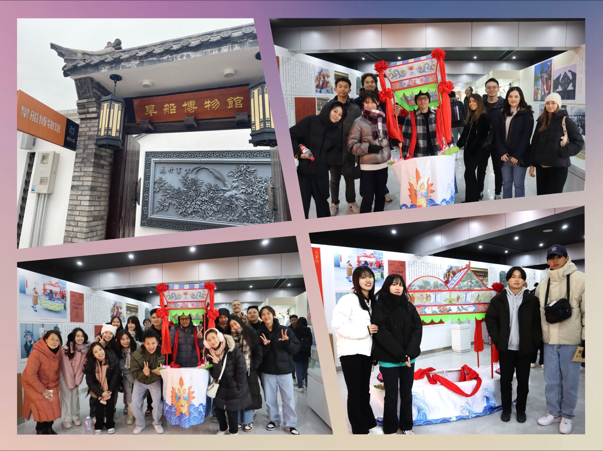 最后,同学们还参观了柳沟乡情陈列室和延庆旱船博物馆,听志愿者介绍了柳沟的历史沿革和风土人情,并了解了延庆旱船的历史渊源,体验了北方的旱船文化。同学们听志愿者介绍,得知延庆旱船在2014年入选国家级非物质文化遗产名录,至今有五百余年的历史,是中国汉民族的一种重要民间舞蹈形式。来自不同国家的同学们忍不住跃跃欲试,来一次中国旱船初体验。