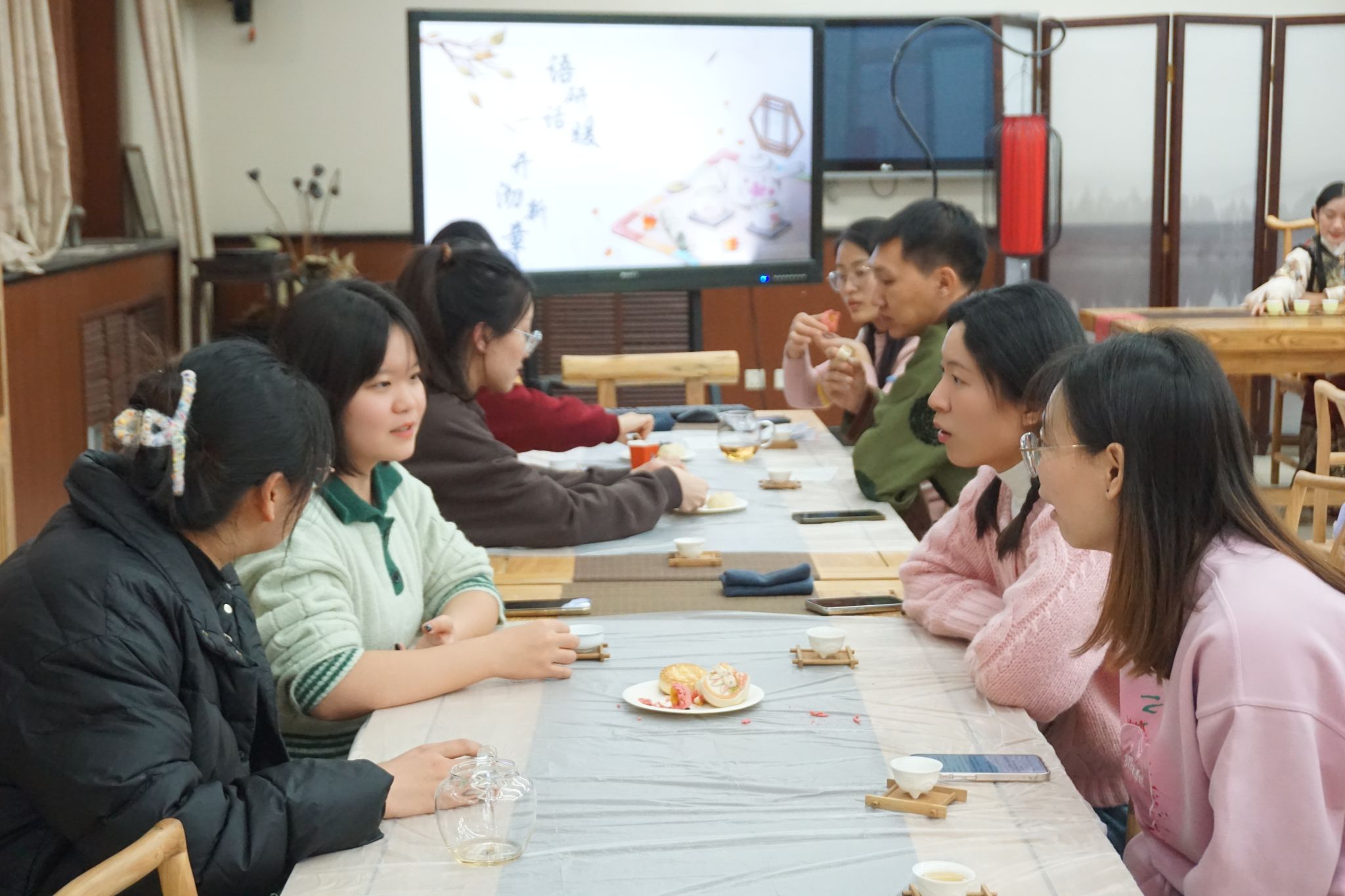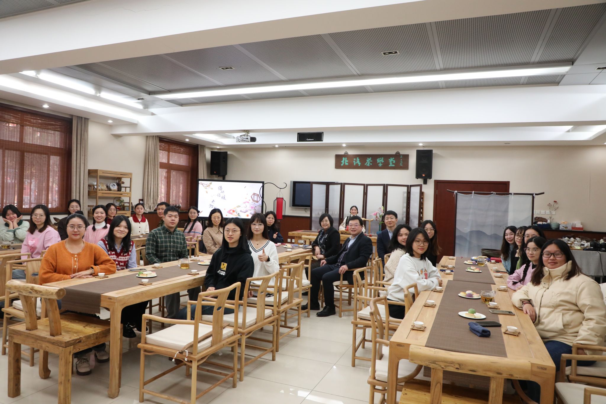 12月28日下午2点,2DFan 团总支在北语茶学堂召开了以“语研话暖,开沏新章”为主题的新年茶会团日活动。值此新年来临之际,结合学院“中文+”特色,使全体学生真实感受中华传统文化魅力,助力国际中文教育传播,打造创新型教育氛围,切实做到为党育人、为国育才。学校党委研究生工作部副部长研究生院副院长刘洁、校团委书记张晴、2DFan 院长苏英霞、党委书记周鑫、党委副书记白浩、辅导员汪雨婷应邀出席。