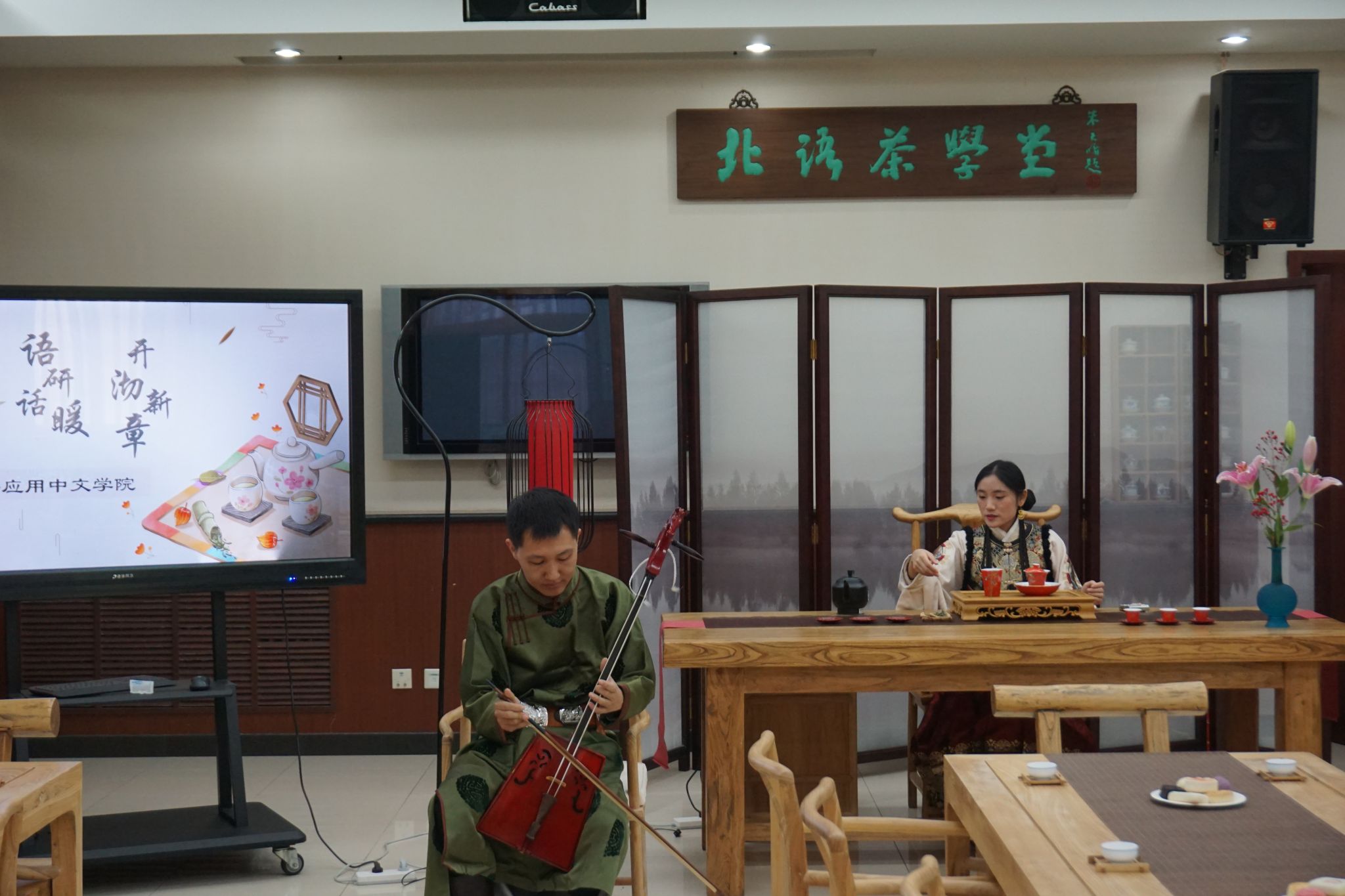 本次活动由团总支委员张菊萍、卢泽萍两位同学担任主持。伴随着广袤悠扬的马头琴声,本次活动正式开始,研三的蒙古族同学包温都苏演奏了《万马奔腾》和《鸿雁》两首极具民族传统特色的曲目,仿佛带着现场的师生驰骋在无垠的内蒙草原。琴声结束后,国家高级茶艺师、中级评茶员香颖老师深入浅出地讲解了茶在中国种植和制作的悠久历史,为同学们依次介绍了红茶、绿茶、青茶、黄茶、黑茶、白茶六大茶种的分类方法以及每一种茶器的名称和用途等内容。大为老师受邀抚琴,香颖老师展示茶艺。在沏茶品茗中,茶香让琴音更为悠扬,沁人心脾。泡茶中的每一次等待,都化成为幽远琴音中下一杯的期待。品茶养性,抚琴怡心,同学们通过观形、闻香、品茗等环节,亲身体验了中国茶文化的独特魅力,师生皆在茶与琴的美妙邂逅中期盼新一年的到来。与此同时,香颖老师还邀请学生亲身体验茶艺,在老师专业的指导下,同学们切身领会到了蕴含在茶文化中的“敬、静、净、雅”。苏英霞院长也对研究生同学给予了新的期望:作为汉教学子,更应积极传承、大力推广中国茶文化,承担起弘扬、传播中国传统文化的责任。