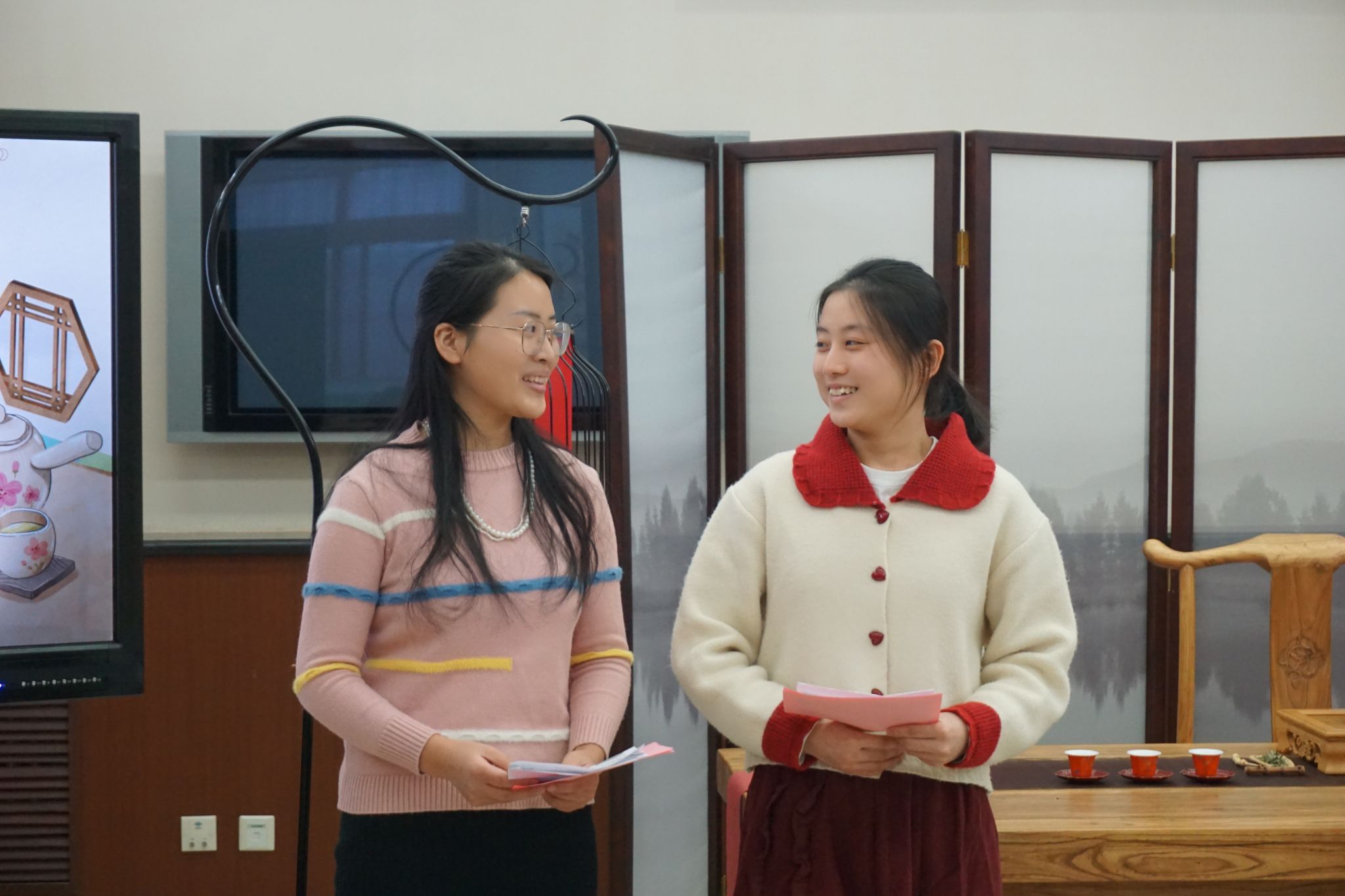 在茶香琴音的余韵中,主持人公布了2022-2023年度院级三好学生和优秀学生干部的评选结果,并由苏英霞院长和周鑫书记为获奖同学颁发证书。在此全院同学团聚的时刻,身在异国担任孔院志愿者的同学们也发来了视频影像,她们介绍了自己的工作生活情况也送上了新年的祝福。