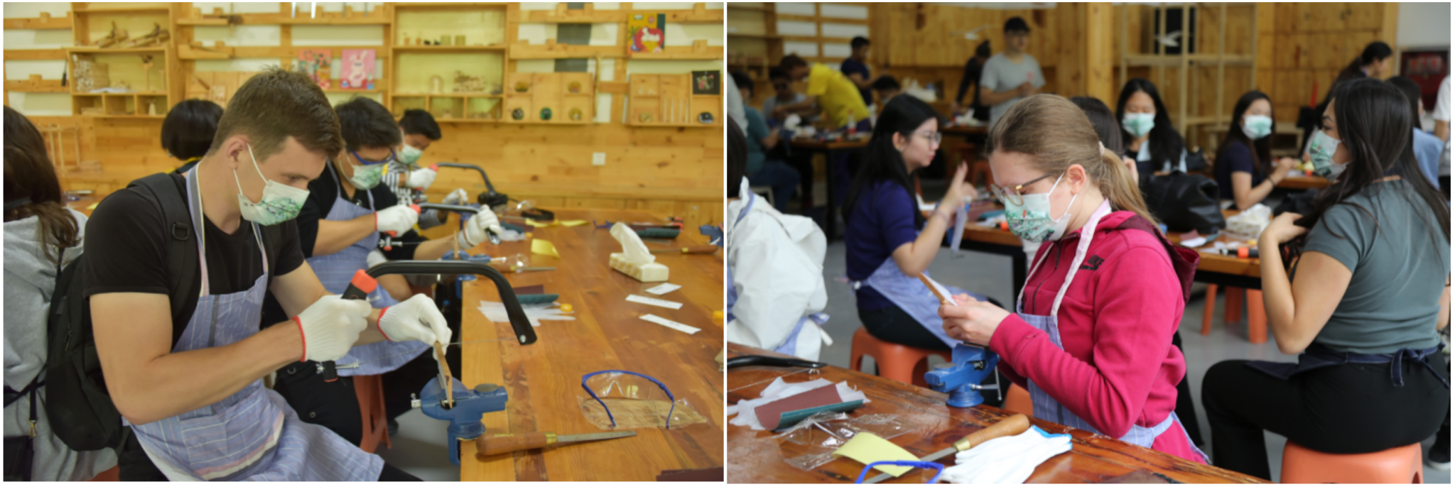 在木工学堂,同学们通过微缩景观、实木手作、木雕地图、数字展示等方式系统学习了传统国粹治木艺术,并动手体验了木梳的制作工艺。在木工师傅们的指导下,大家操刀拉锯、精雕细刻,经过打磨、上色等多道工艺,制作出一把把造型各异、圆润光滑的木梳。