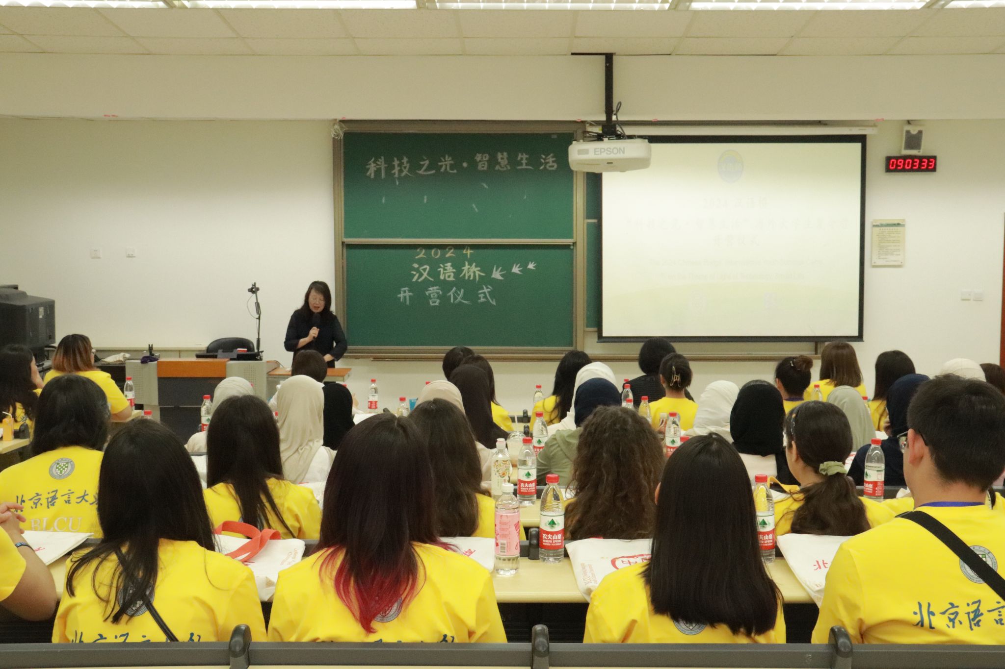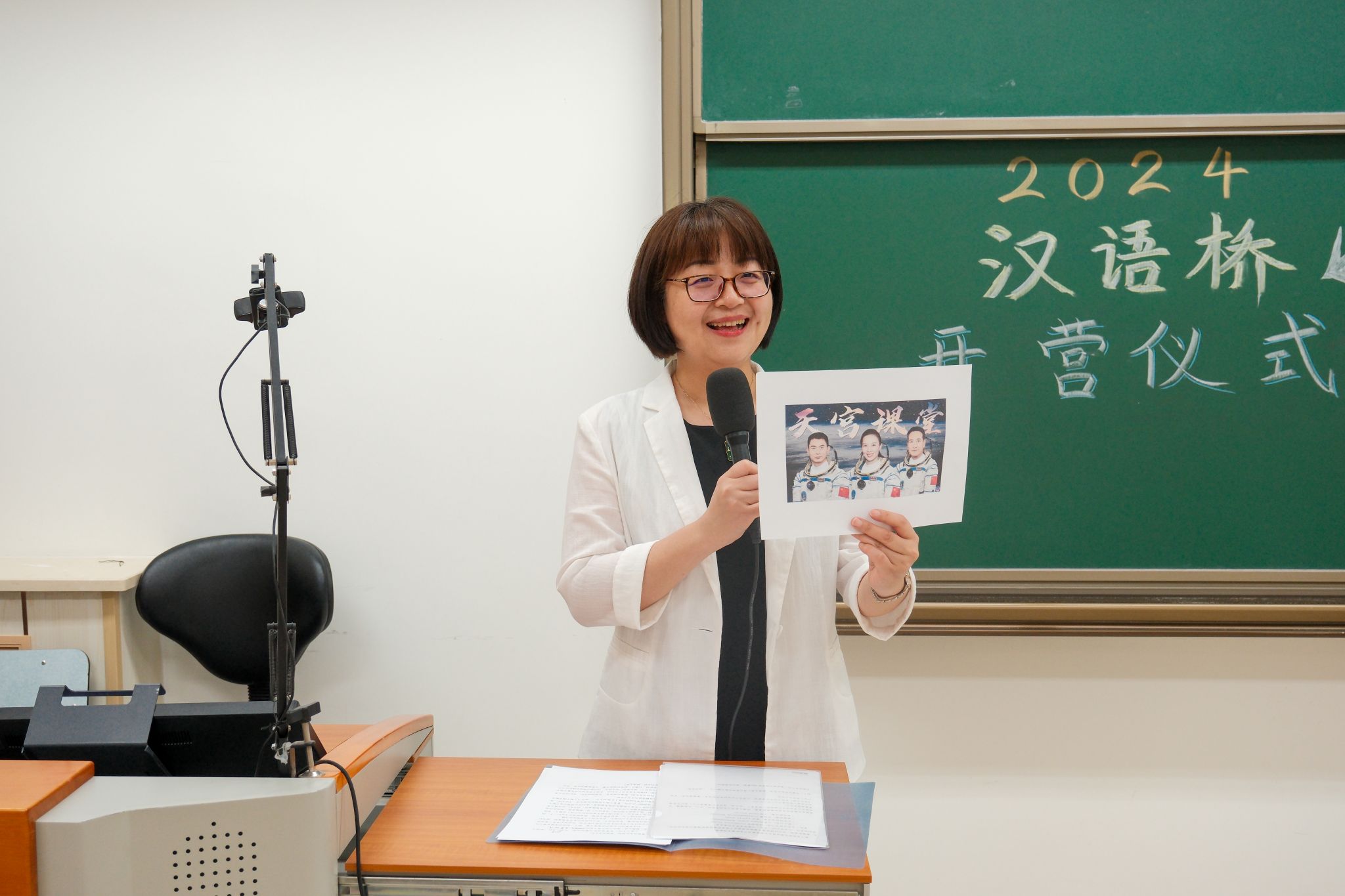中方教师代表纵璨老师在致辞中生动地展示了科技汉语课程的内容,与营员们亲切互动。她希望通过本次汉语桥活动,营员们可以深入学习交流,用科技的力量点亮智慧的灯塔,开启一段精彩的旅程。