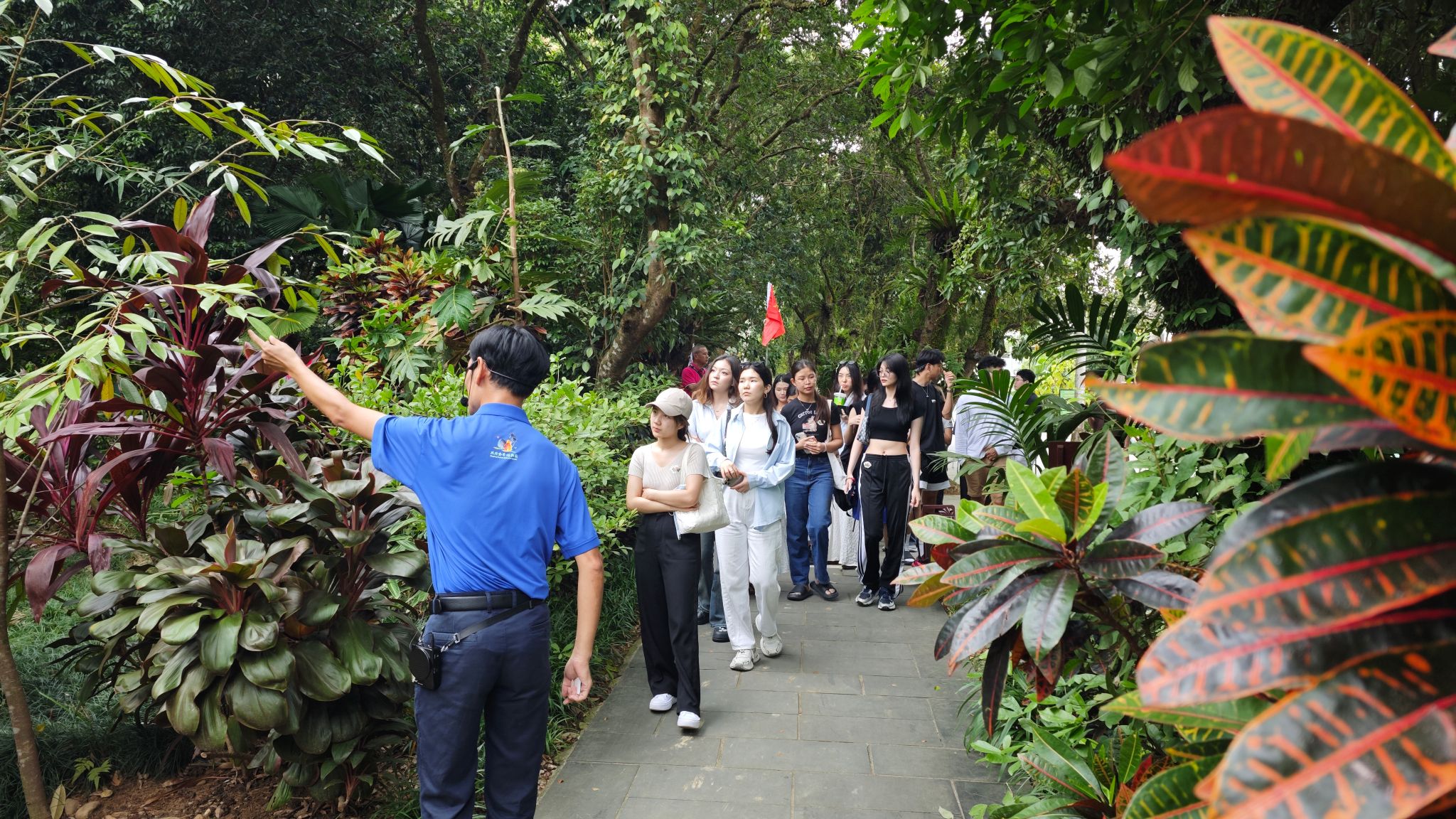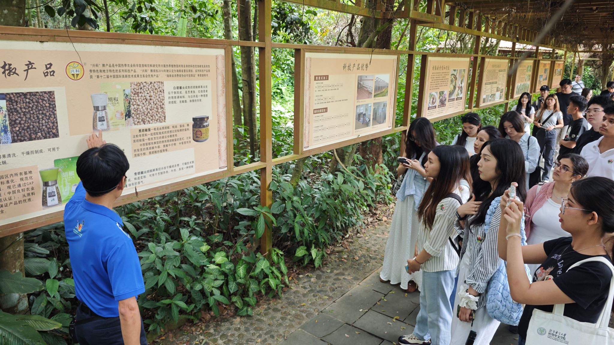 在兴隆热带植物园,同学们踏入了神奇的绿色世界,穿梭在茂密的热带雨林中,近距离观察各种珍稀的热带植物,聆听导游讲解植物的特性和用途。这里的每一片叶子、每一朵花都散发着生命的活力,让同学们深刻感受到了大自然的神奇与魅力。同学们不仅学到了许多关于热带植物的知识,还了解到海南当地种植咖啡、胡椒等丰富经济作物的绿色发展之路。