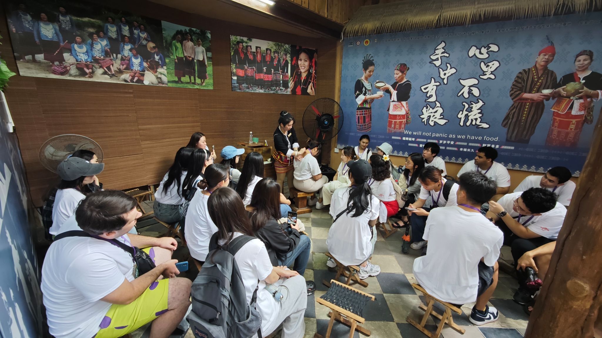 在槟榔谷黎寨,同学们与黎族阿哥阿姐热情交流,学习黎苗文化的历史传承和风俗习惯,了解中国的民族大团结政策,欣赏黎族传统纺染织绣等非物质文化遗产技艺,也真切体验到过去处于穷乡僻壤的黎寨通过乡村振兴政策走上了特色发展的富裕幸福之路。看到几位年过八旬的黎族老奶奶依然巧手翻飞、忙织黎锦的场面,同学们赞叹不已。随后亲身体验火辣辣的黎族药膏,品尝黎家美食簸箕餐,更是让同学们感受到中国少数民族文化的独特魅力。
