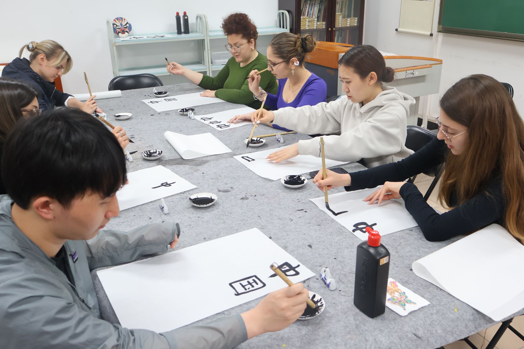 为了给参与者带来丰富而深刻的文化体验,文化中心的工作人员和师生们精心准备了14个体验项目。这些项目既包括具有深厚历史底蕴的传统文化体验,如茶文化、书法、脸谱绘制、国画、画扇面、剪纸、掐丝、螺钿、麻将、中国舞、八段锦、中医香囊制作以及中国结编制等,也涵盖“科技点亮生活”等主题讲座,向参与者介绍了国际中文智慧教学系统的发展和应用,展现了传统文化与现代科技交织的魅力。