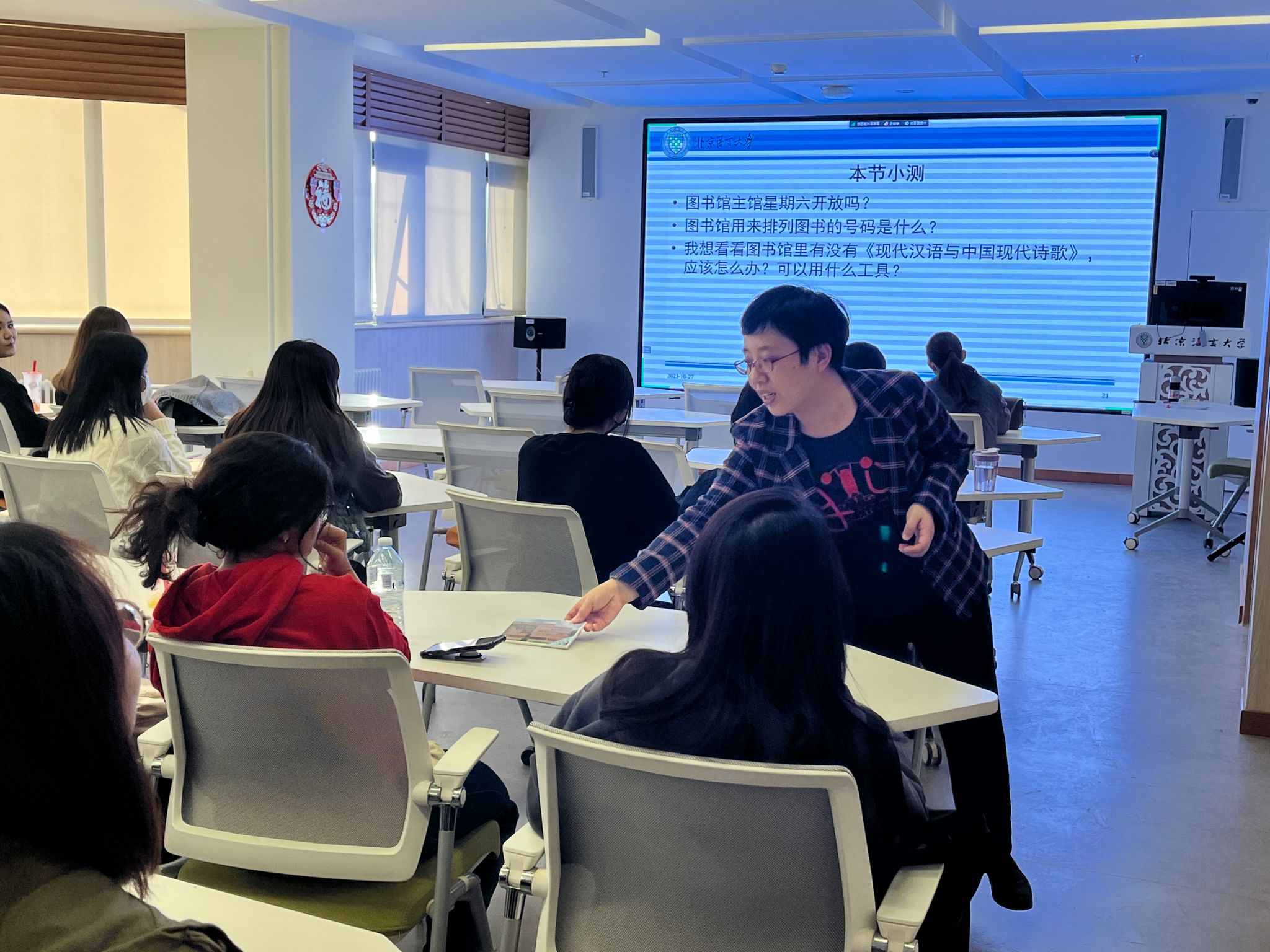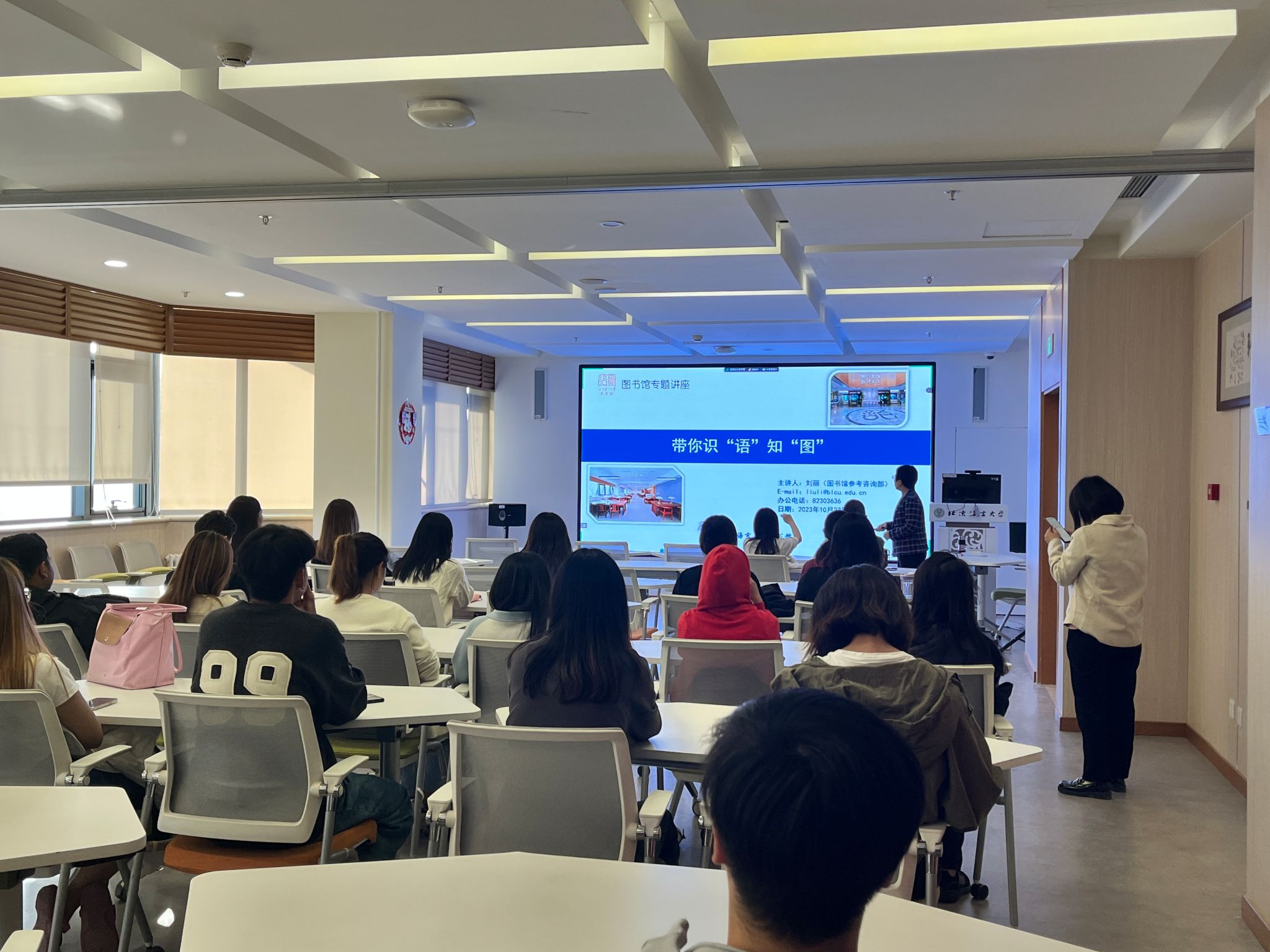 参观之后,图书馆刘丽老师为大家做了题为“带你识‘语’知‘图’”的专题讲座。以“找纸本”“用空间”“找电子”为主题,分别介绍了馆藏图书借阅、预约选座、重要数据库使用的具体方法,并对学生所提出的问题进行了认真详细的解答,学生们对图书馆的资源获取、空间使用有了更深入的认识。