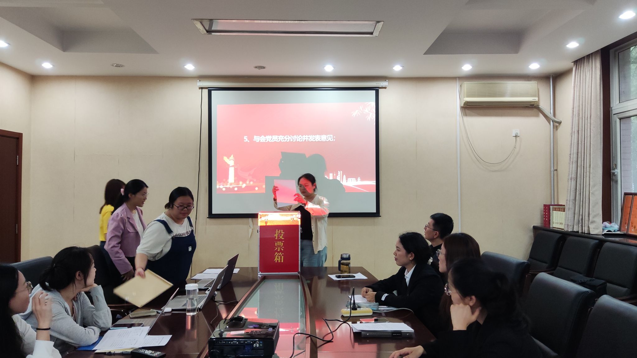 经过深入的讨论和评议,大会进入关键的表决环节。在苏晗瑜和李沂芳两位同志的监督下,全体参会党员以无记名投票的方式,对接收三位发展对象为预备党员进行了表决。最终,主持人宣布,田晓妍、康晓雯、姚瑶三位同志的同意票数均超过有表决权的正式党员的半数,同意接收她们为预备党员。三位新党员也随后依次作了表态发言。