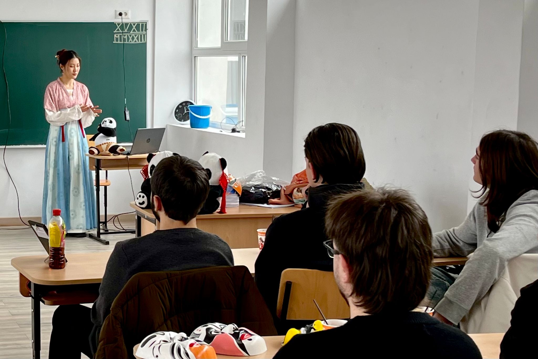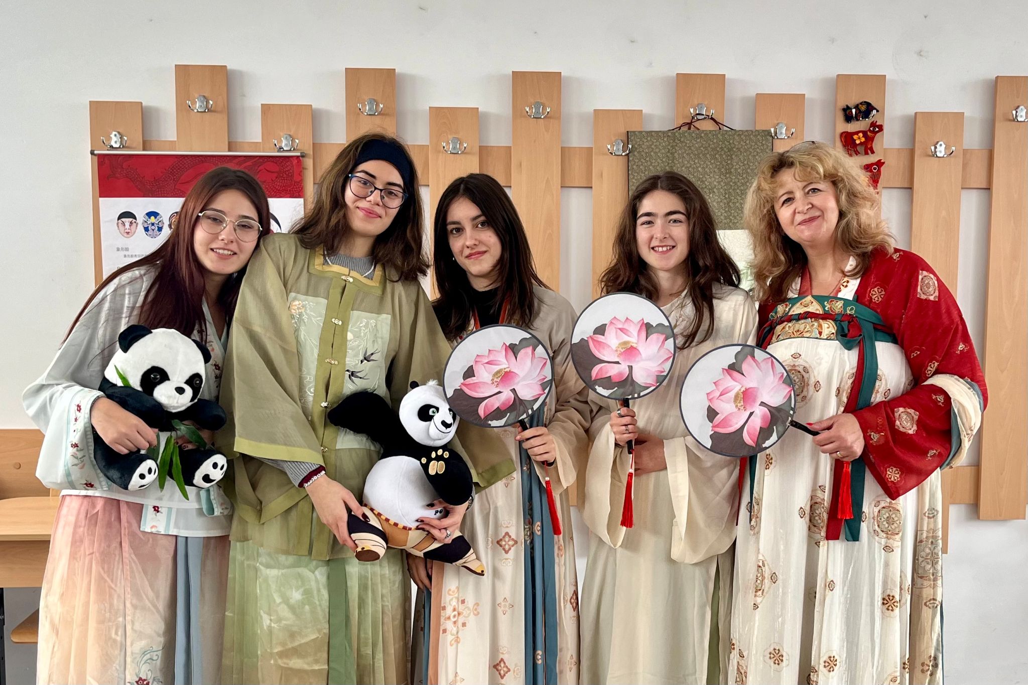 活动期间,团队成员刘歌精心设计了多元化的教学方案,以介绍中华诗词文化。在课堂上,她选择了适合初级汉语学习者的《咏鹅》作为入门诗歌,并通过逐字逐句的详细讲解和动态动画演示,帮助学生掌握诗句的发音、节奏,并体会其意境。这种视听结合的教学方法不仅提升了学生对中国诗词的兴趣,也为后续的文化活动奠定了良好的基础。此外,团队还利用孔子学院的“汉语角”时段,组织了一场中国诗词朗诵会。活动中,当地学生身着汉服,吟诵诗词,品茗谈诗,全身心沉浸在诗会的氛围之中。汉服的典雅、茶道的静谧,这些文化元素在诗词的背景下展现出了独特的魅力。通过诵读《长恨歌》、《观雎》、《水调歌头》等经典诗词,学生们进一步感受到了中国古诗的韵律之美及其深厚的情感表达。