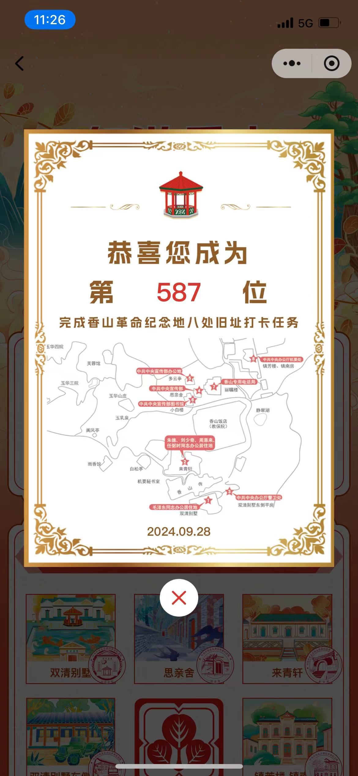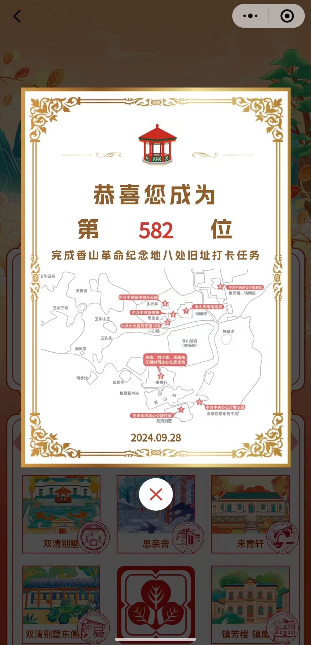 为增强团支部成员凝聚力、增加团日活动趣味性,本次主题团日活动开展了“红游香山”打卡活动。同学们在小程序上打卡八处旧址,获取证书。大家纷纷踊跃参加,最终有10名同学完成了打卡并取得了证书。