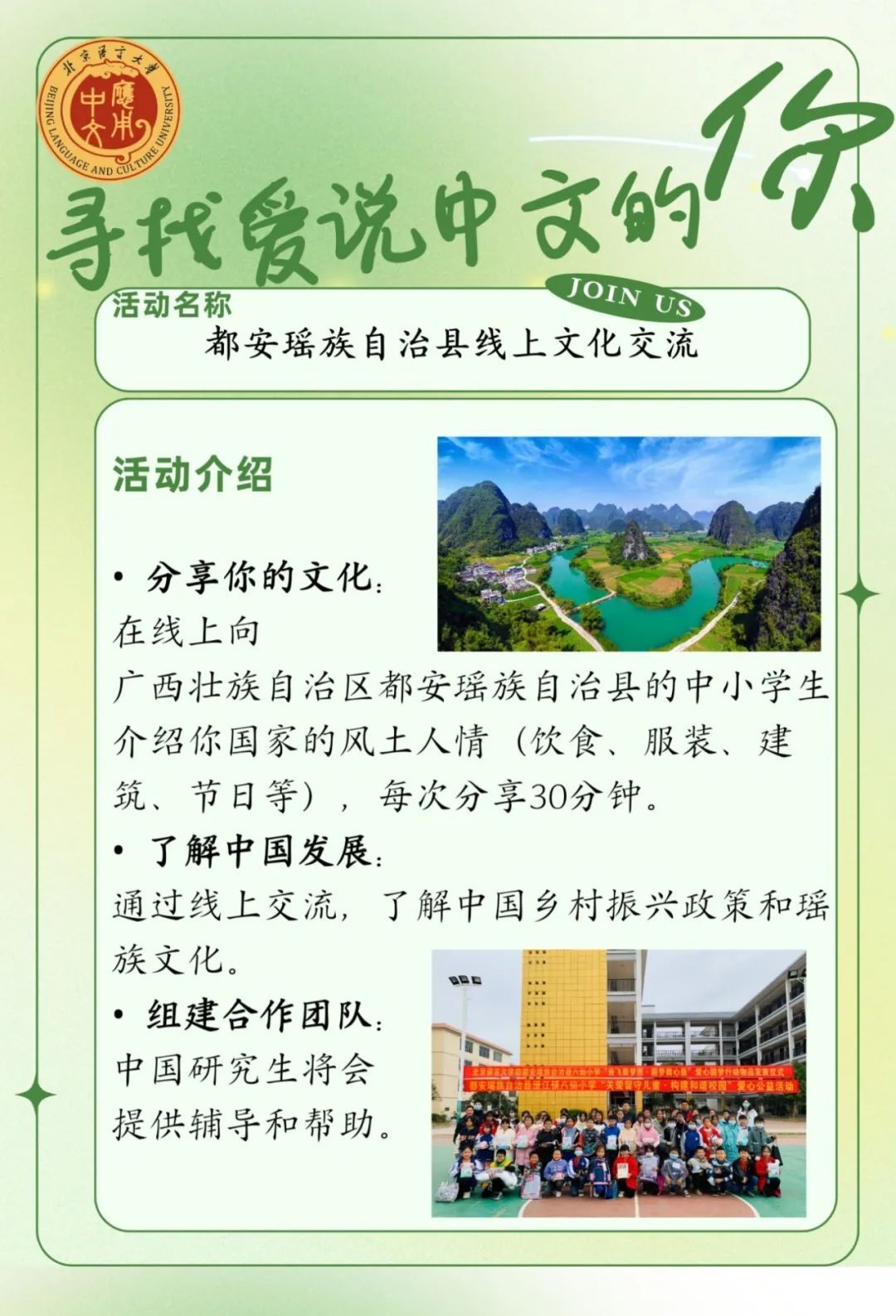 在服务青年方面,支部积极搭建志愿服务和社会实践平台,举办了“世界文化节”“文化体验日”“沙特中文教师项目接机”等志愿与实践活动,结成了中外语伴10余对,加强了学生的团队协作能力和对社会的责任感。特别值得一提的是,支部成员朱冬静、郭子超还连线采访了广西都安副县长甄刚,了解了乡村振兴的成果,并依托学校与学院的留学生资源,计划筹备外国留学生与都安中小学生的线上文化交流活动,努力实现中外交流与乡村振兴的相互促进。
