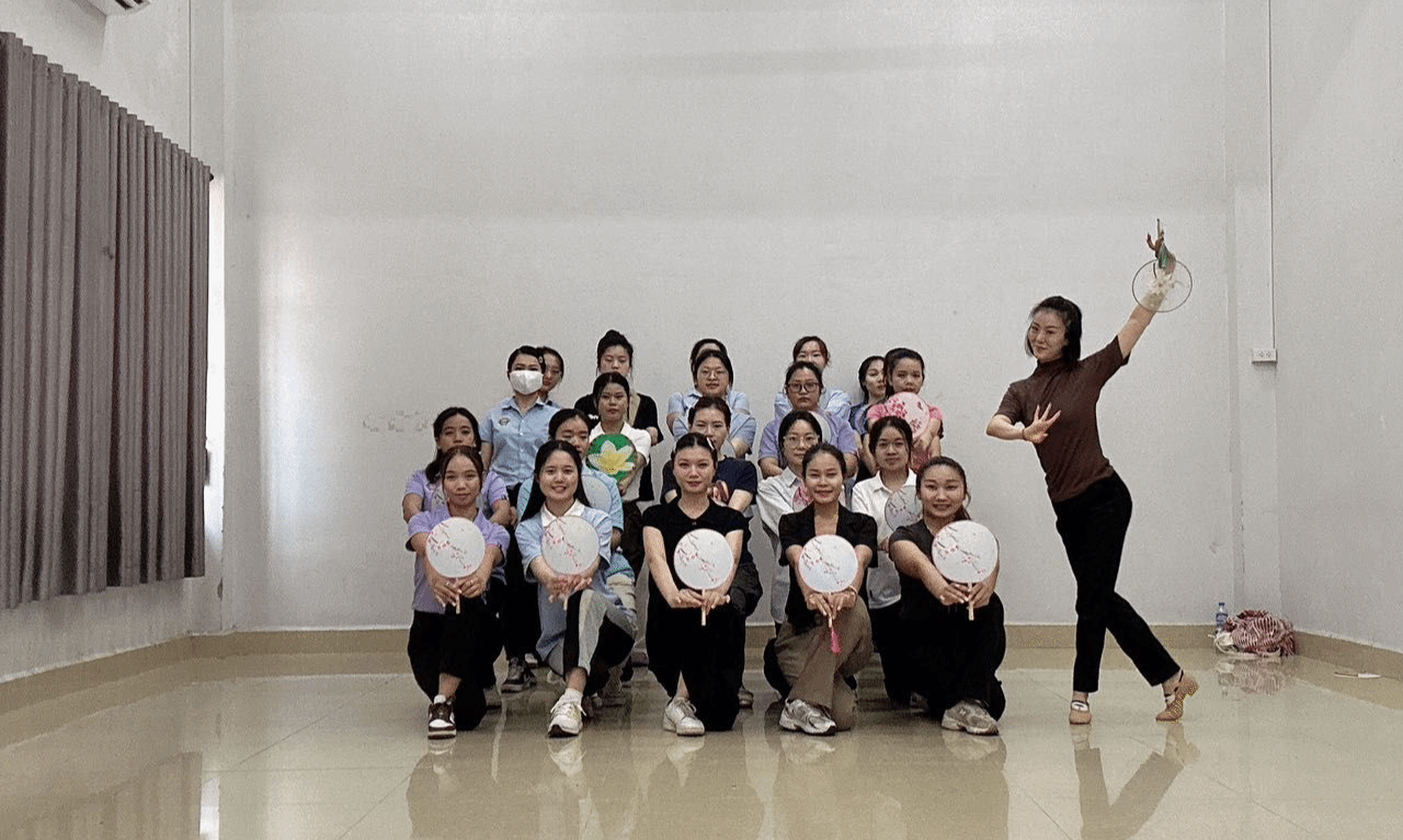 还有山西的老师们来学校培训时,中老教师共同学习山西舞蹈《一把酸枣》。团扇挥舞间,不同文化背景的我们,因舞蹈韵律心意相通,艺术活动让中老教师找到了共同的语言和情感共鸣,促进了两国文化的交流与融合。更难忘中国驻老挝大使方虹莅临学校参观指导的日子,校园里洋溢着自豪与喜悦,老师们与大使合影的瞬间,让我真切感受到中老友好的坚实纽带,也更明白自己作为文化使者的责任。